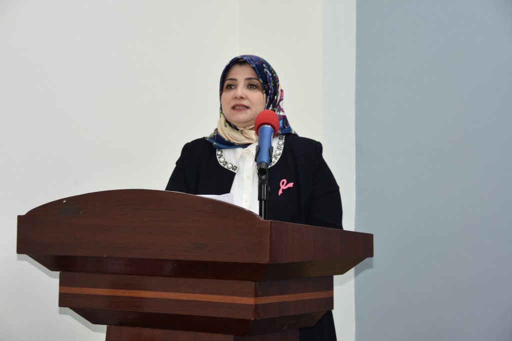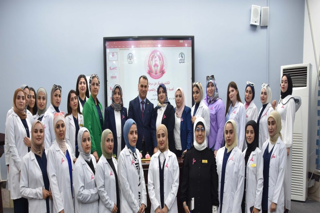 كما القت الاستاذ الدكتورة اخلاص علي حسين محاضرة بينت فيها طرق الكشف المبكر عن سرطان الثدي ،و هذه الطرق هي الفحص الذاتي للثدي و الفحص السريري و الفحص الشعاعي (الماموگراف ) ،