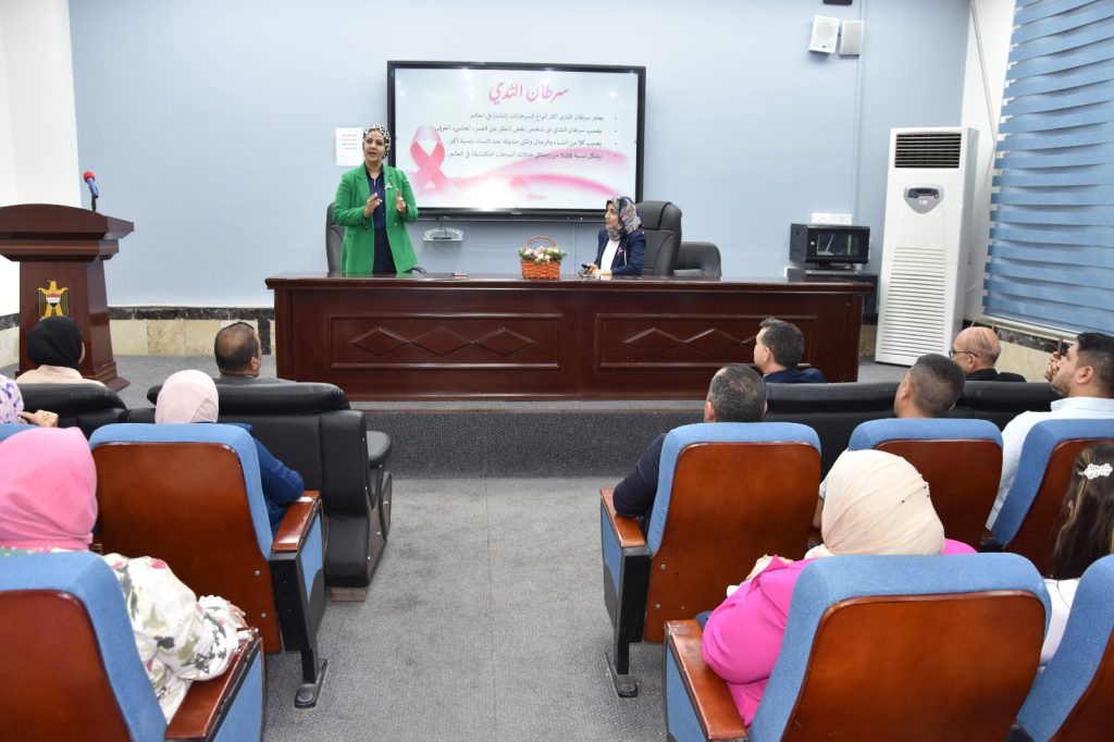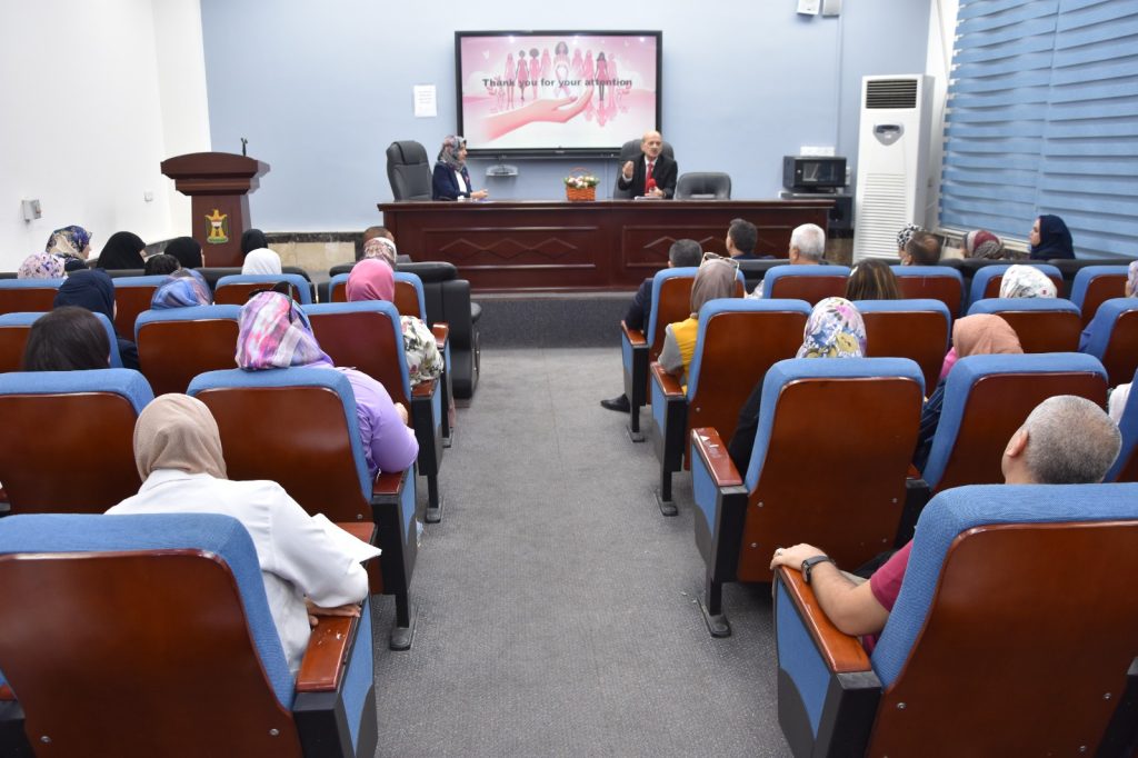 وقد القى الاستاذ الدكتور جمال القيسي محاضرة علمية توعوية عن اهمية الكشف المبكر عن مرض سرطان الثدي وامكانية الشفاء التام من هذا المرض عند تشخيصه في المراحل الاولية وحث القيسي الحضور على اهمية اجراء الفحوصات الدورية التي قد تجنب الشخص المصاب المضاعفات التي تحصل نتيجة الاهمال وعدم مراجعة الطبيب.