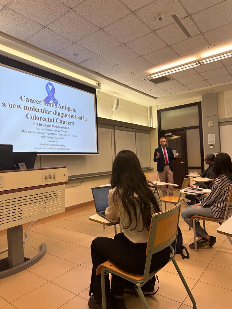 القى رئيس فرع الاحياء المجهرية واستاذ المناعة في كلية الطب بالجامعة العراقية الاستاذ الدكتور احمد رشدي الدرگزلي محاضرة علمية في قاعة الدراسات العليا الخاصة بالجامعة الامريكية في القاهرة تحت عنوان :