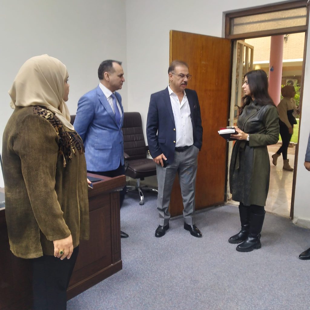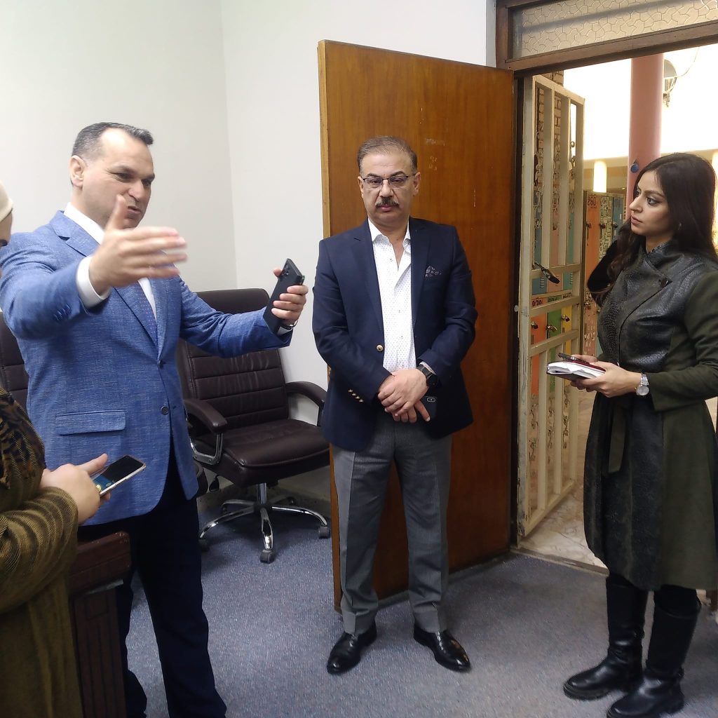 والتقيا السيد مدير المستشفى الدكتور حارث عبد الجبار ايوب وتباحثا معه الية العمل المشترك بينهما مع امكانية فتح قاعة دراسية داخل المستشفى لطلبة الكلية.
