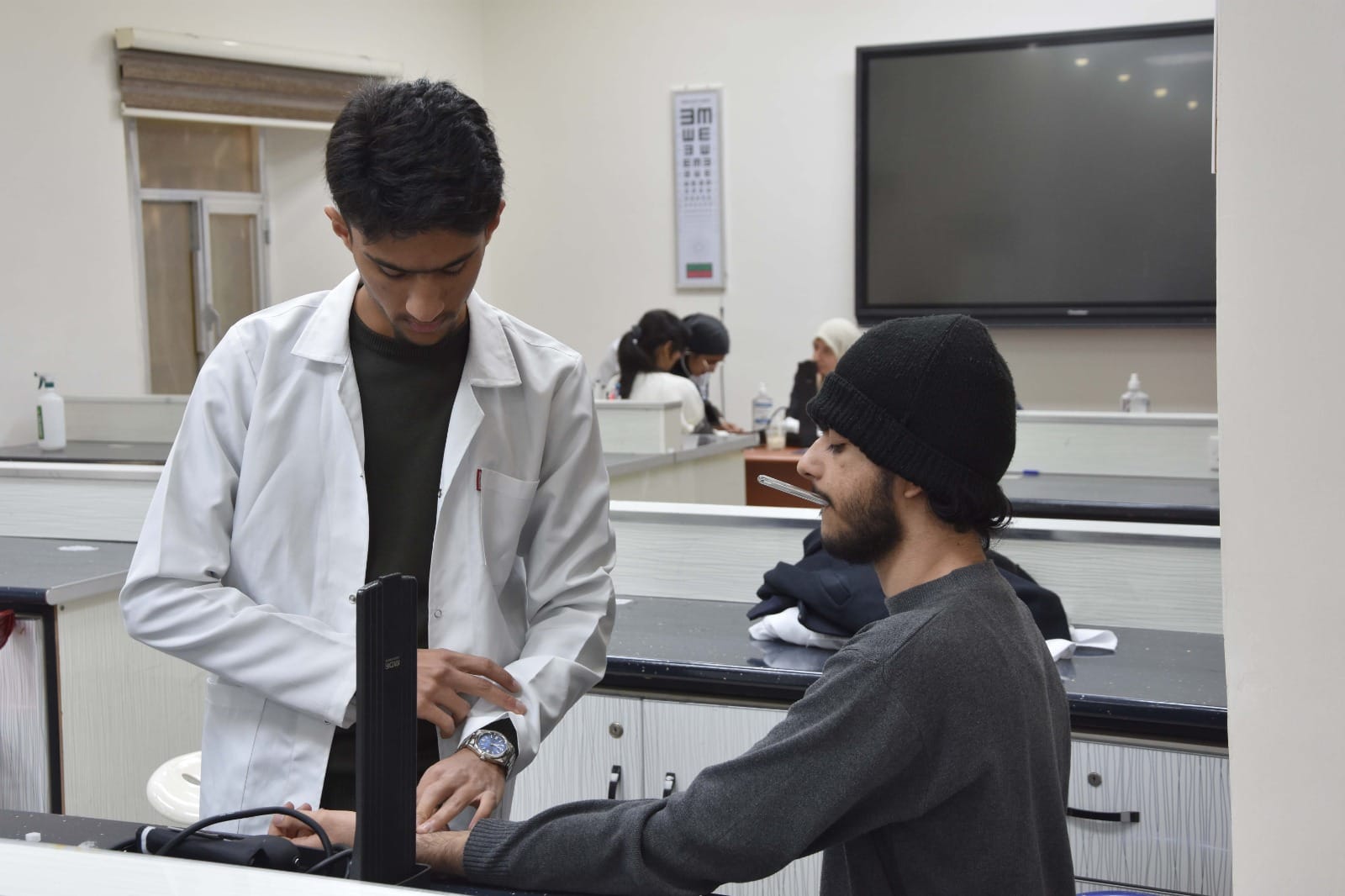 وكان تطبيق الطلبة للطريقة العلمية في قياس درجة حرارة الجسم وقياس الضغط والنبض وقراءة تخطيط القلب بصورة ممتازة من قبل الطلبة