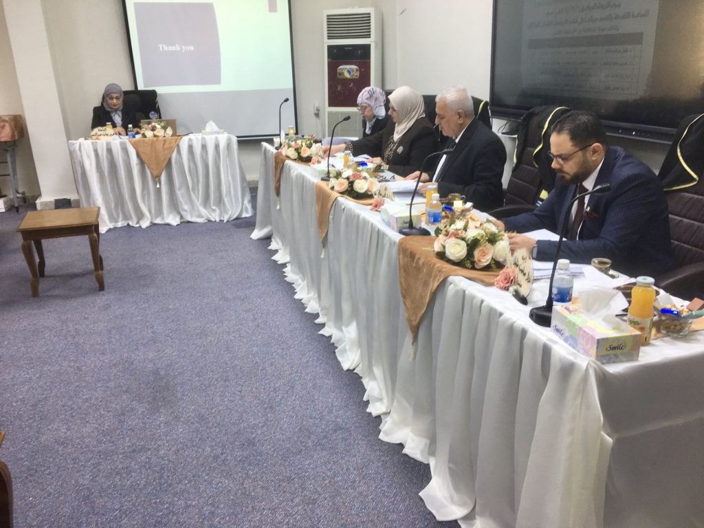 هذا وحضر المناقشة السيد عميد الكلية الاستاذ الدكتور احمد نزار الدباغ ومعاونه للشؤون الادارية أ. م. د.هيفاء محمود فهد وعدد م̷ـــِْن الاساتذه والباحثين.